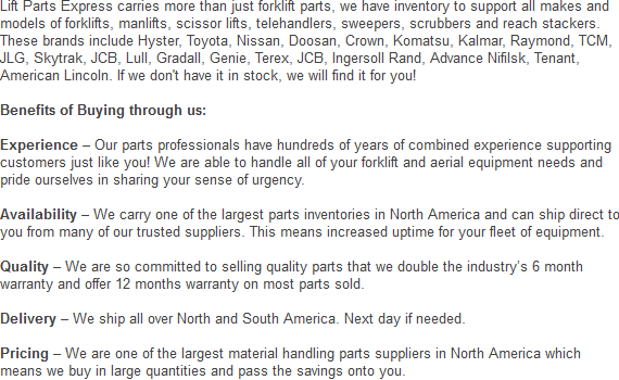 For your entire fleet of lift trucks, we provide the best deals on all our parts. Give us a call now if you have an interest in getting a price quote for our attachments or parts. Our number is:
